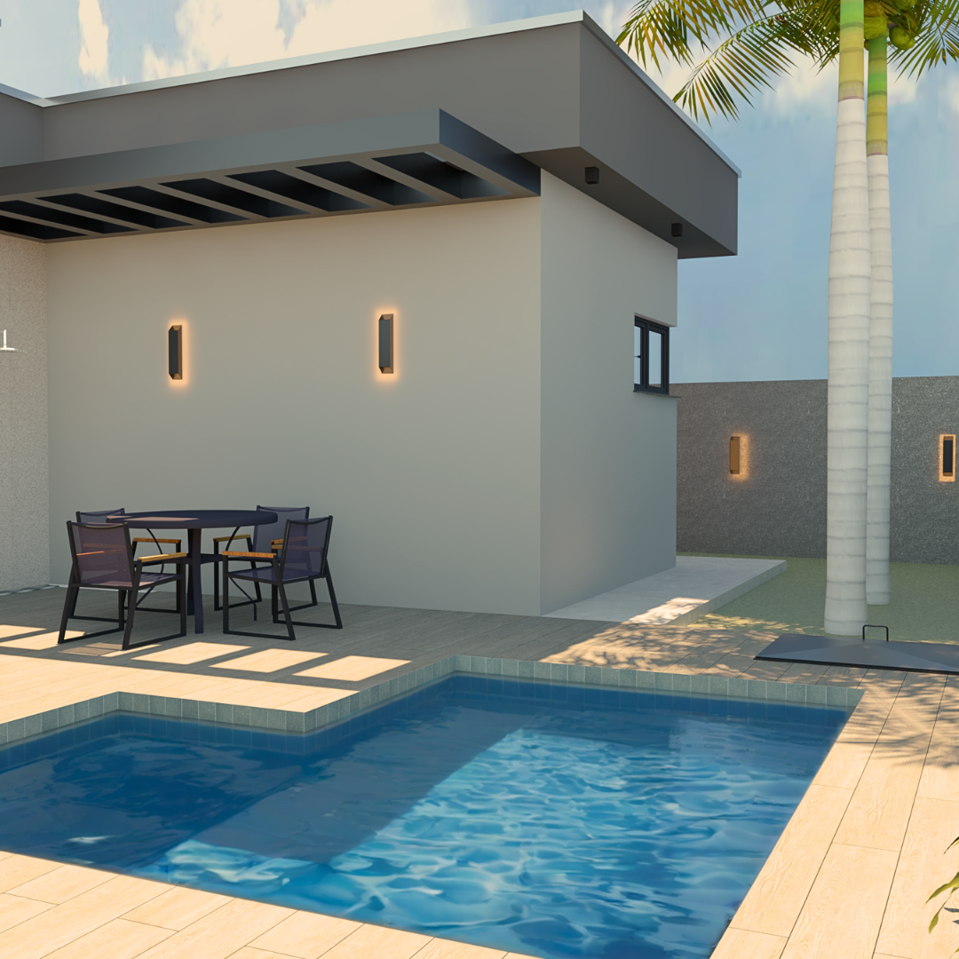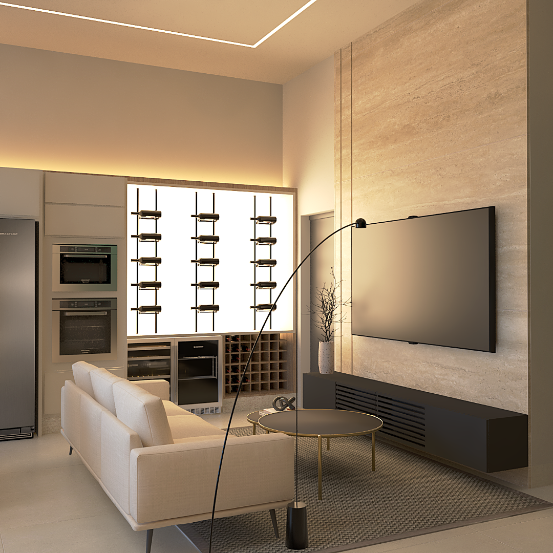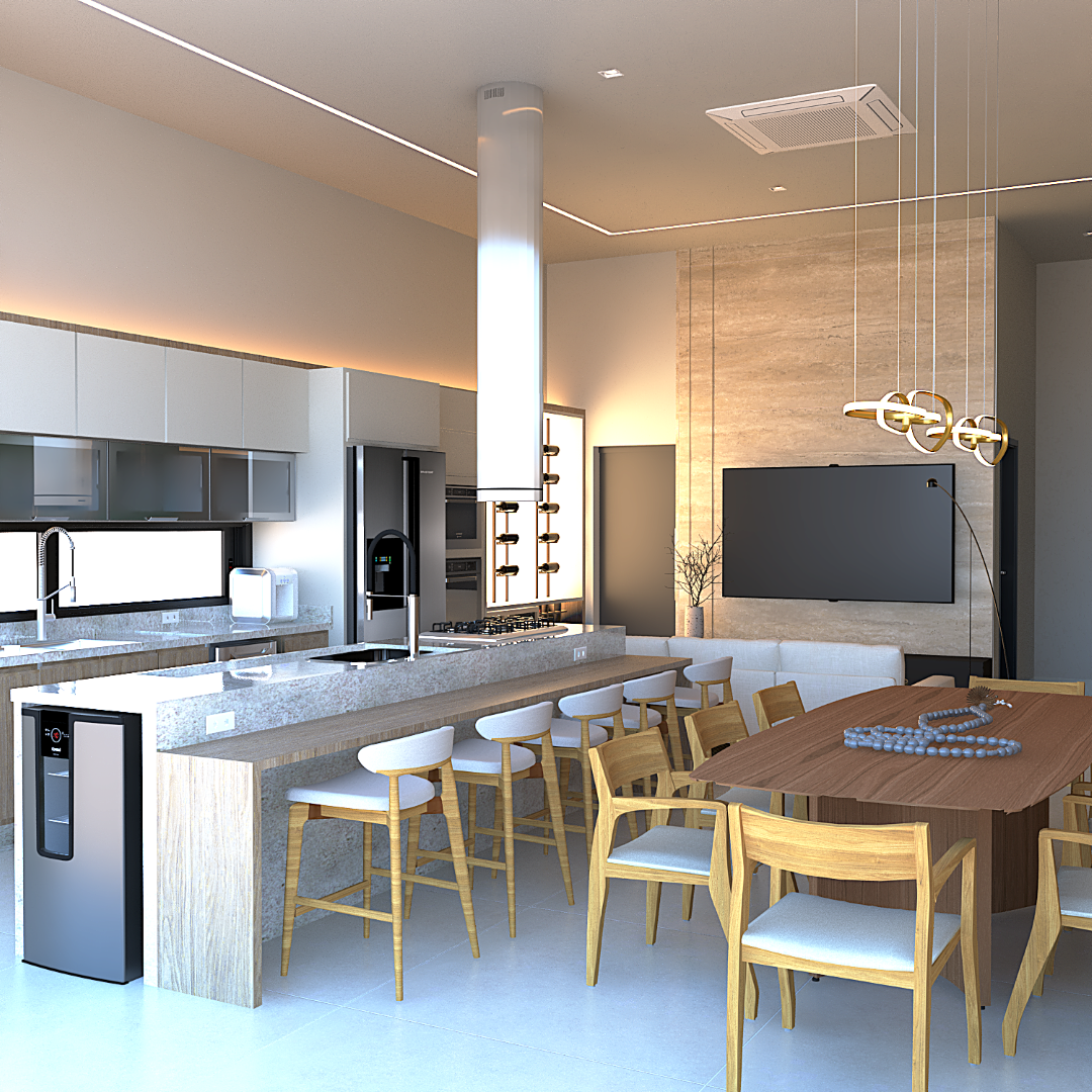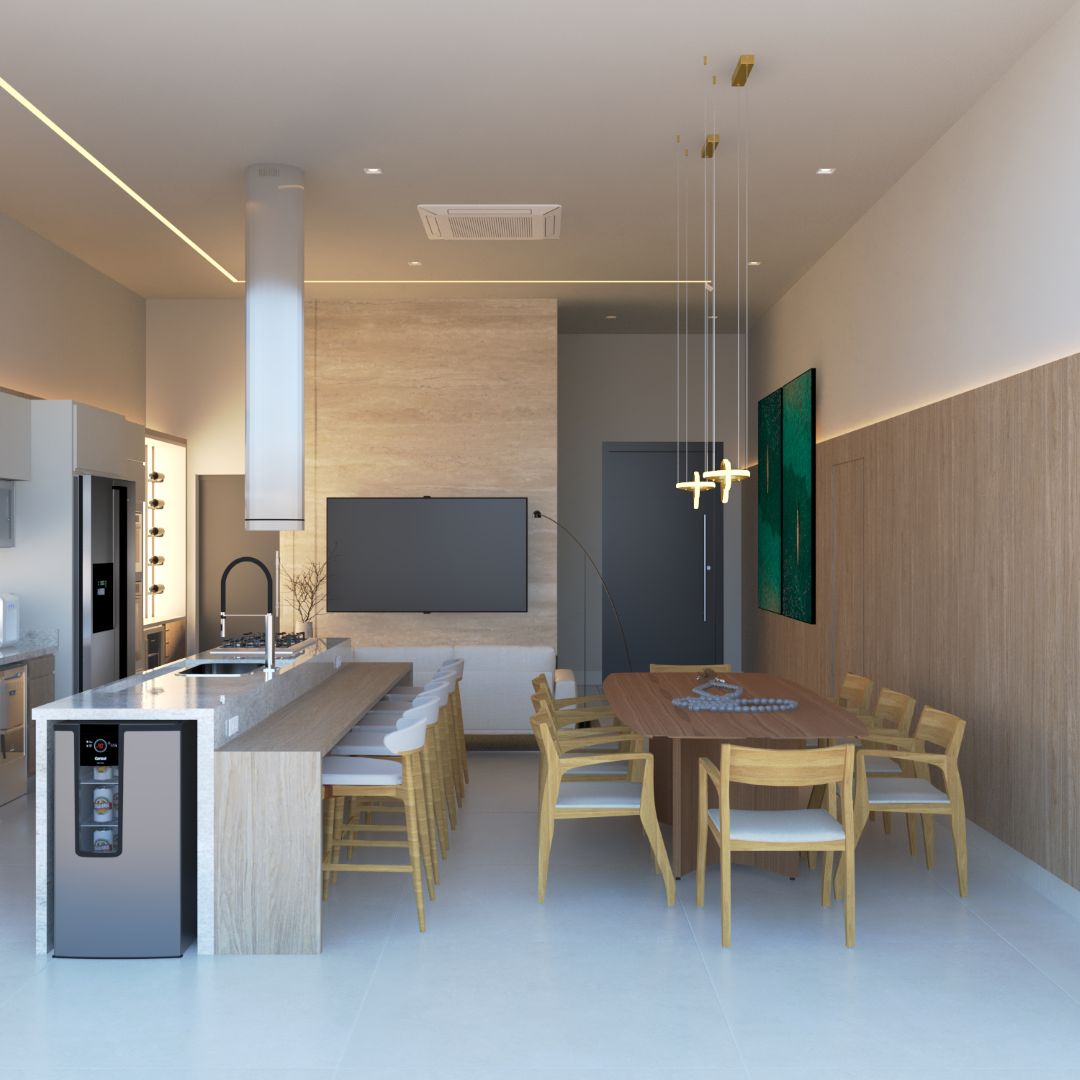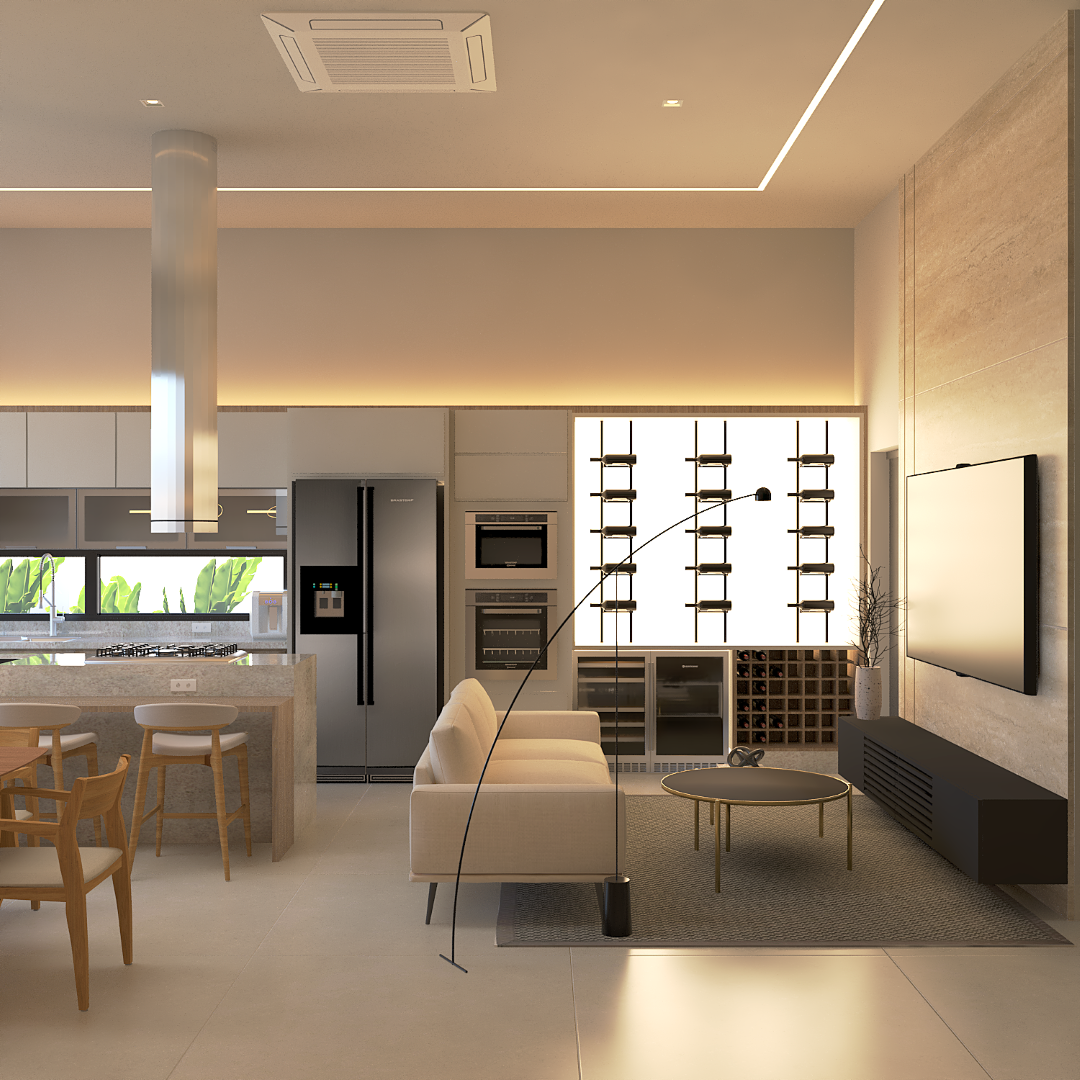 A proposta prioriza circulação fluida, conexão entre os espaços sociais e privados e uma linguagem arquitetônica contemporânea.